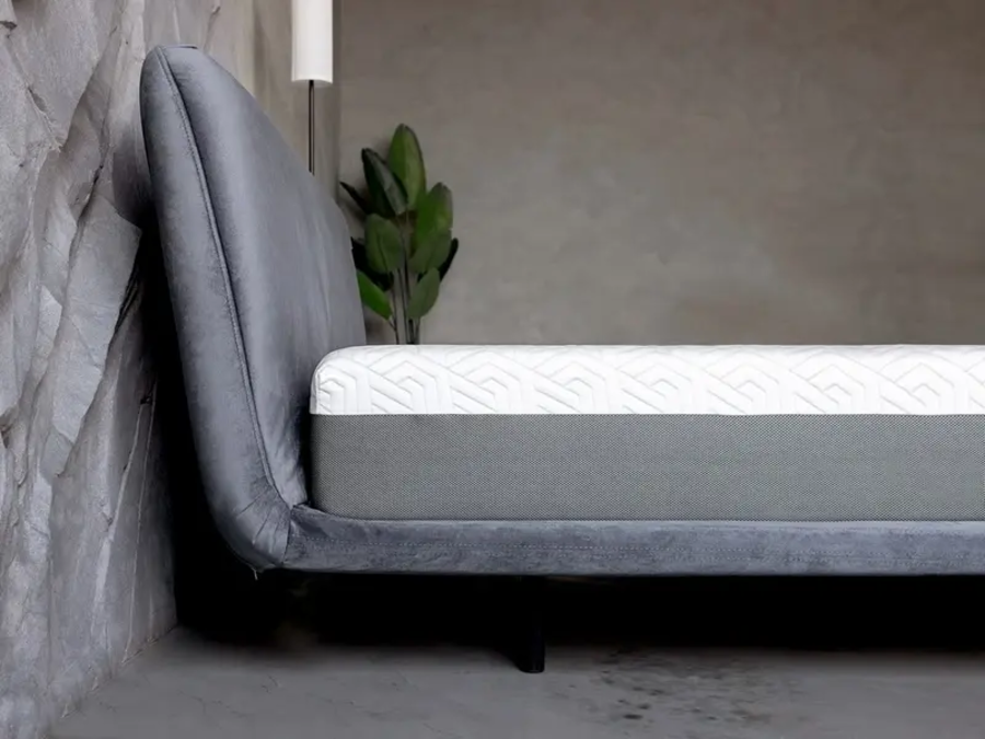 Опорная база кровати смещена к центру, а контур кровати остаётся свободным. Из-за этого создаётся ощущение лёгкости, будто конструкция висит над полом.